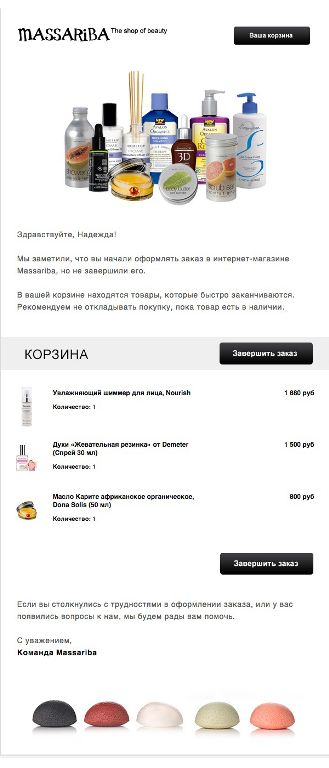 В третьем письме можно быть настойчивее. После 3-й попытки шансы продать сильно падают. Напрямую командовать «Купи!» всё же не стоит, вместо этого хорошо работает приём создания ощущения срочности. Сохраняя дружелюбие, озвучьте сроки хранения брошенной корзины, действия спецпредложения, скидки или бонуса.