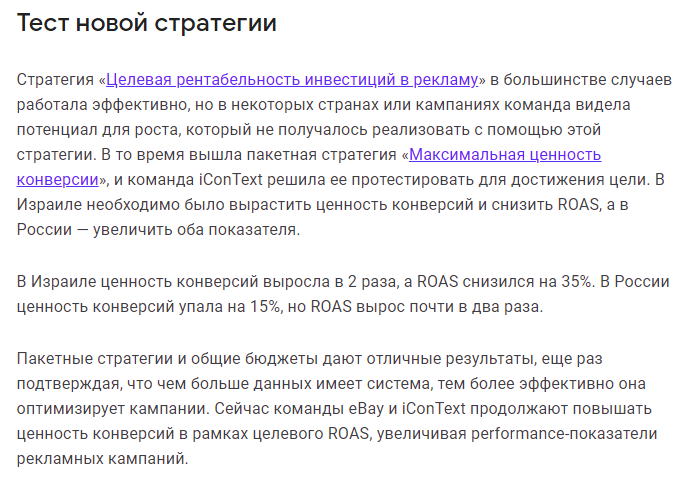 «Целью эксперимента было увеличить ценность конверсий в рамках целевого ROAS. Команде performance-агентства iConText, которая помогает eBay достигать результатов в Google Ads, предстояло изменить конверсии в аккаунтах Google Рекламы, заменить “Целевую цену за конверсию” на стратегию “Целевая рентабельность инвестиций в рекламу”», — говорится в кейсе.
