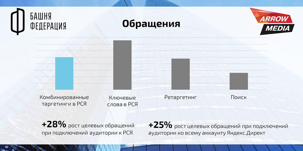 Среди клиентов агентства «Мосфильм», GeekBrains, Oreo, 1С и другие крупные клиенты. А в анкете участника ArrowMedia предоставили кейс работы с премиум-аудиторией в рекламной сети Яндекс при продвижении «Башня Федерация». Настроенные агентством комбинированные таргетинги привлекли аудиторию, которая обладала достаточной суммой для покупки недвижимости. А рост обращений из РСЯ составил 28%