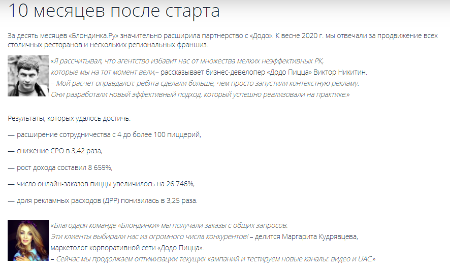 Кейс «Додо пиццы» агентство предоставило и в анкете участника рейтинга Ringostat. На старте работ в сентябре 2019 года каждый франчайзи сети продвигался самостоятельно. Из-за этого возникала проблема перетекания заказов: клиент приходил на сайт из объявления одного заведения, но делал заказ в другом. Проконтролировать такую внутреннюю конкуренцию было невозможно, поэтому агентство убедило руководителей ресторанов объединиться в своеобразный «альянс» и запустить совместную рекламную кампанию. К весне 2020 агентство занималось продвижением всех столичных франшиз и нескольких региональных. К моменту написания кейса число онлайн-заказов увеличилось на 26746%, а рост доходов составил 8659%.