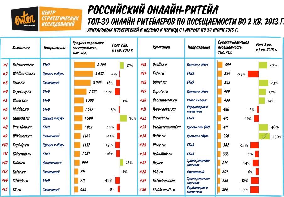 Прошлый год: ТОП 100 Российских интернет-магазинов по категории, обороту, количеству посетителей и конверсии.