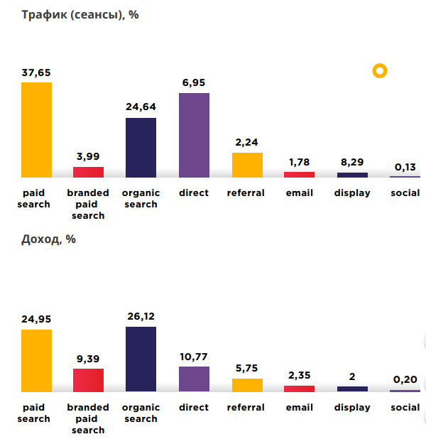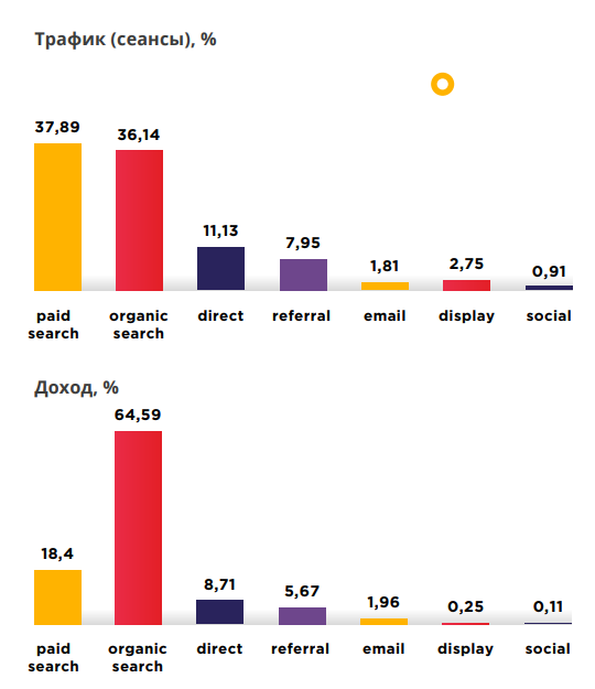 Пока в привлечении трафика в этой категории лидирует контекстная реклама. Причем 4% приводят брендовые запросы, они же генерируют почти 10% из общего дохода. В связи с этим стоит использовать названия брендов в рекламе и следить, чтобы конкуренты не использовали ваше имя в рекламных объявлениях, а спорных случаях жаловаться на конкурентов.