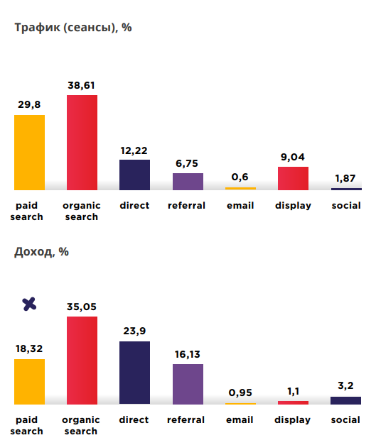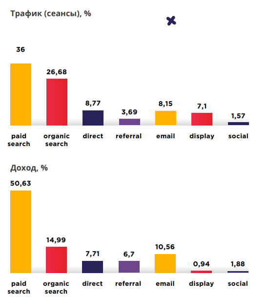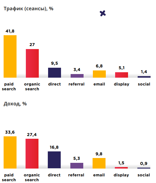 Меньше трафика и дохода приносит email. Это связано с тем, что электроника относится к товарам предварительного выбора, поэтому потребители долго сомневаются при покупке, а скидка или брошенная корзина не так сильно повлияют на принятие решений.