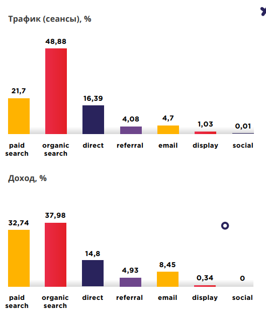 Самым результативным каналом по трафику и доходу является органическая выдача: в три раза выше показатели доходов из соцсетей, чем в среднем по рынку. Ведь товары для декора и дизайна покупают "глазами". При этом в этом сегменте почти не работает email-маркетинг.