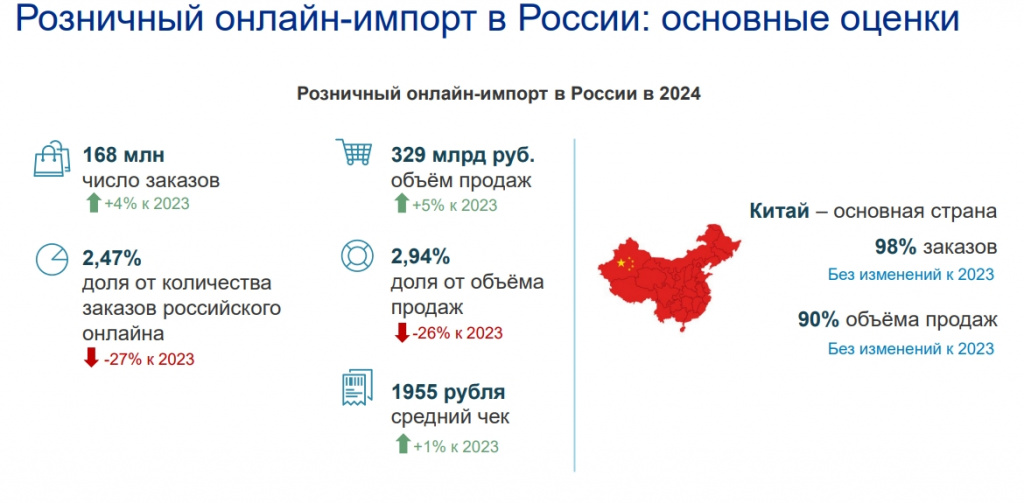 В 2024 году объем розничного онлайн-импорта в России составил 329 млрд руб., что эквивалентно 2,94% от общего объема внутренней онлайн-торговли. Число заказов достигло 162 млн (2,47% от всех посылок в российской электронной коммерции). По сравнению с 2023 годом денежный оборот вырос на 5%, а количество заказов — на 4%. Средний чек увеличился на 1%, составив 1 955 руб.