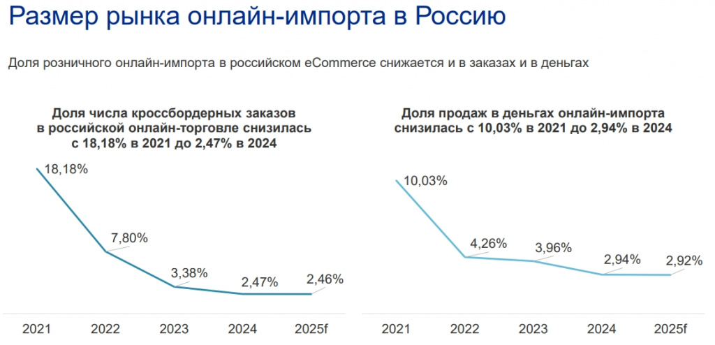 Доля трансграничной торговли в общем объеме российского e-commerce остается небольшой. Если в 2018-2019 годах она достигала 30%, то к 2024 году снизилась до 3%. Это связано с нарушением логистических цепочек из-за пандемии COVID-19 и западных санкций, а также с сокращением беспошлинного лимита с 1000 до 200 евро в апреле 2024 года, что привело к уменьшению числа частных заказов из-за границы. В случае уменьшения/отмены санкций, импорт, по оценке участников рынка, будет основан на трех основных регионах - Китай, европейские страны, США.
