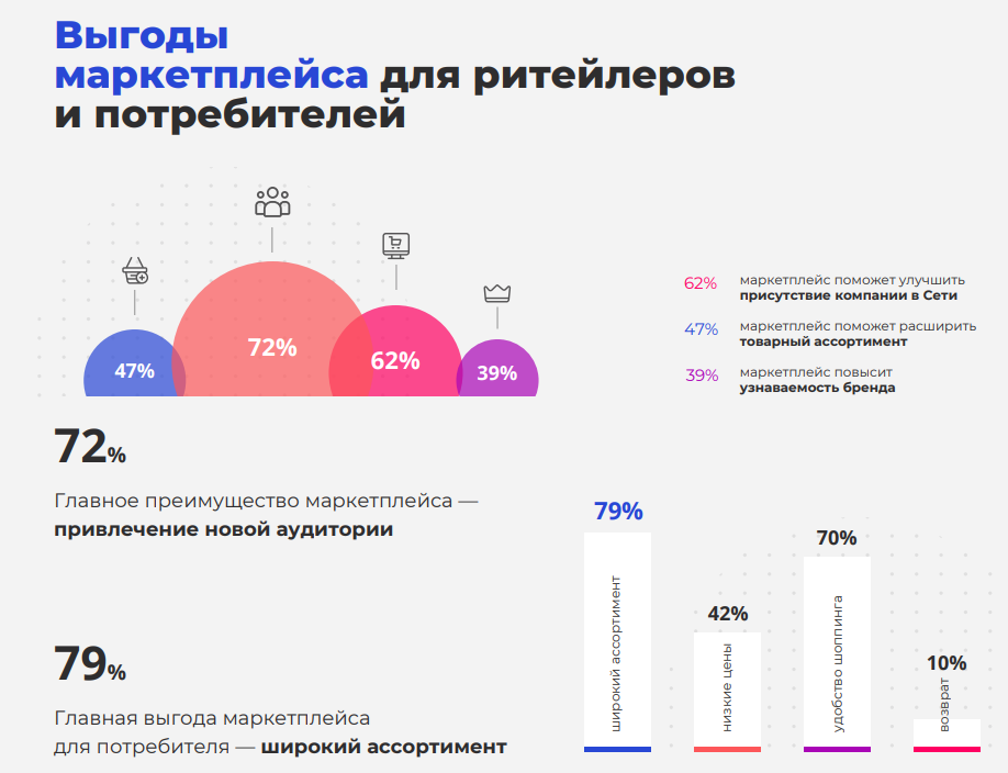 Что касается выгоды для клиентов, то ритейлеры голосуют за широкий ассортимент товаров. Онлайн-маркетплейсы могут предлагать сотни товарных категорий с сотнями тысяч товаров от тысяч продавцов. Физические торговые центры никогда не приблизятся к таким цифрам. Поэтому 79% ритейлеров голосуют за широкий товарный ассортимент как важнейшую выгоду маркетплейса для потребителей.