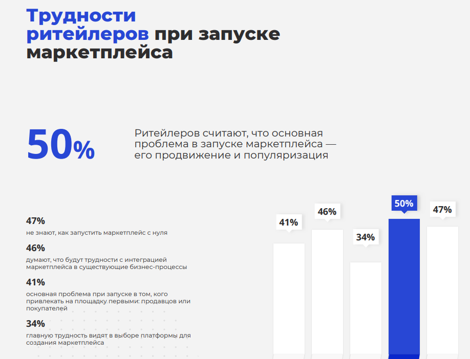 Также в исследовании ритейлеры поделились своими опасениями и сомнениями по поводу запуска маркетплейса. 61% респондентов считают, что на запуск площадки может уйти слишком много ресурсов. Одной из главных трудностей и статей расходов может стать продвижение маркетплейса: за это проголосовали 50% ритейлеров. Вторая по значимости трудность на этапе запуска - как, собственно, запустить маркетплейс с нуля. Как показало исследование, 47,5% российских ритейлеров просто не знают, с чего начать.Денис Егоров, ("Холодильник.ру"): "Вовремя "оседлать" модную волну, предоставив производителям возможность напрямую коммуницировать с аудиторией на своей площадке, может быть правильной стратегией".