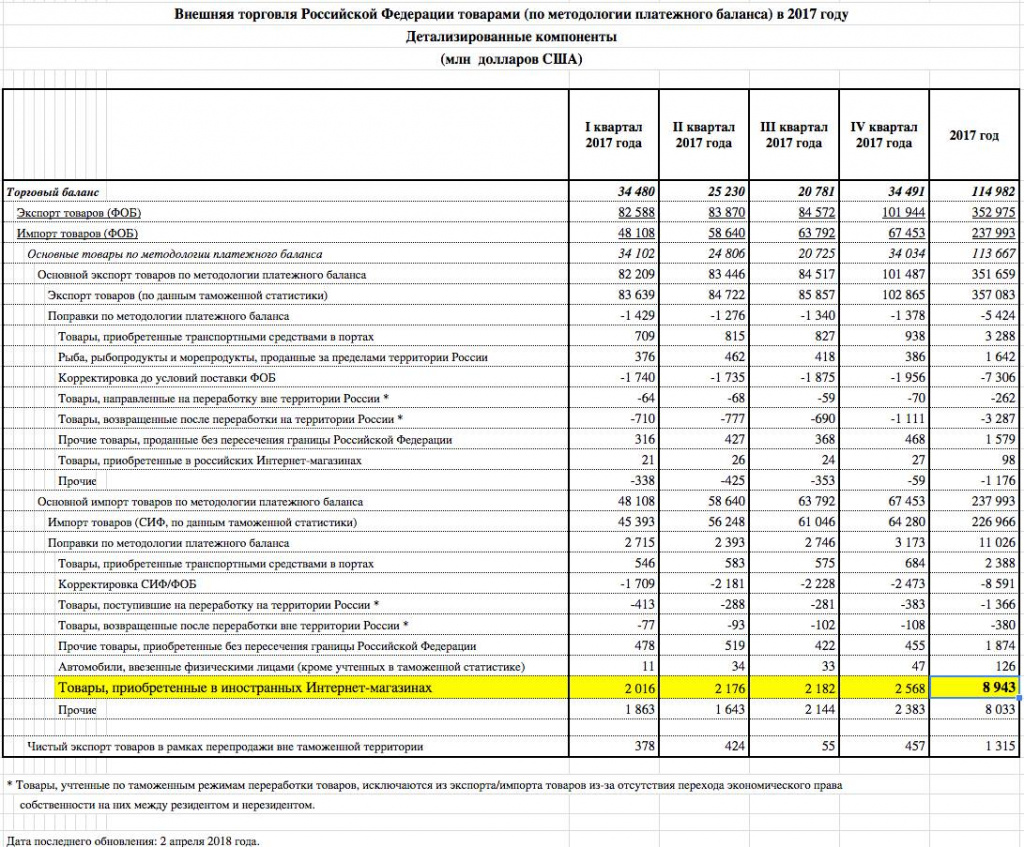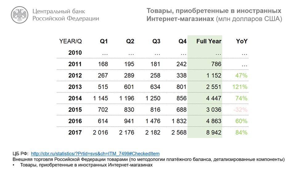 Напомним, что, согласно данным ЦБ, трансграничная торговля за 2017 год составила $8,9 млрд., то есть порядка 500 млрд рублей (если среднегодовой курс принять за 55 рублей за доллар).