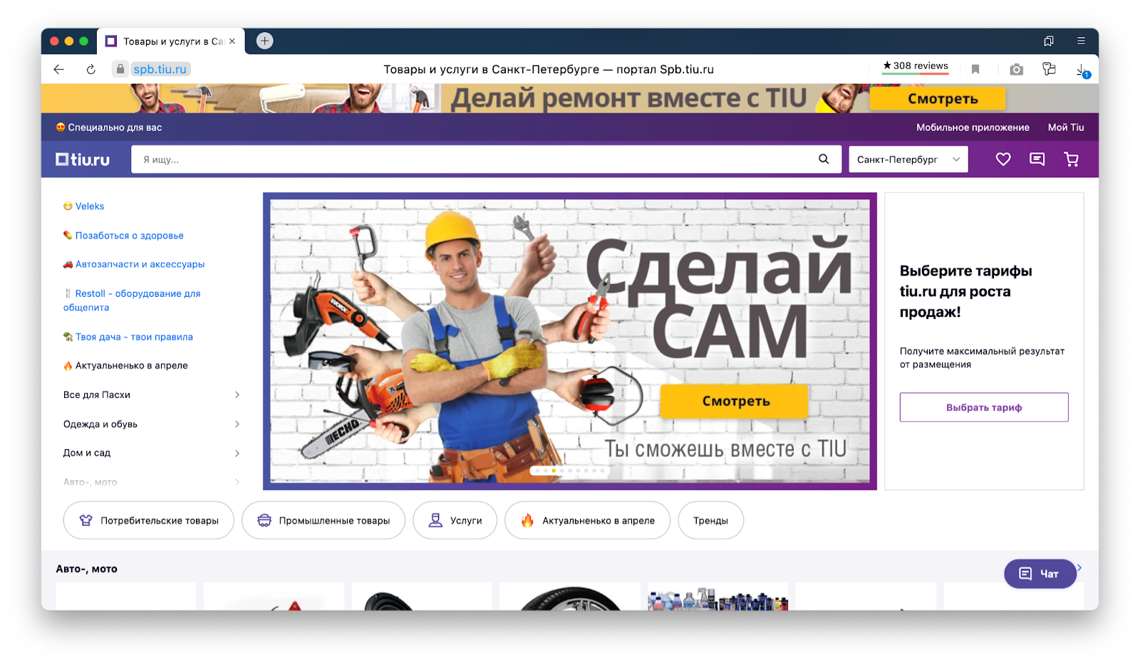 Что за площадка. Крупная торговая площадка, которая работает с 2008 года и по посещаемости всего в несколько раз уступает «Озону». Tiu.ru — один из первых по поисковым запросам, связанным с DIY-товарами: строительство, ремонт, дом и сад, авто-мото, спорт и отдых, рыбалка, охота. При этом площадка малоизвестна, продавцов и, как следствие, конкуренции на ней заметно меньше, чем на крупных маркетплейсах.