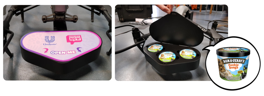 В рамках показательных полётов, чашечки мороженого Ben & Jerry (по 72 гр. каждая) были доставлены в заранее определенное место назначения дроном. Демонстрация проводилась в рамках сервиса Unilever "Ice Cream Now" ("Мороженое сейчас").