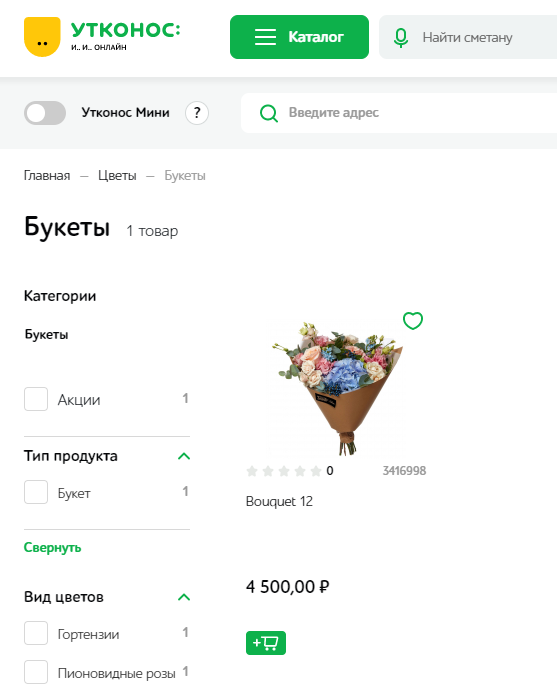 Партнёром этого направления стала московская студия флористики "Ботаника", предлагающая цветы премиум качества. На момент написания статьи на онлайн-витрине Утконоса доступен 1 букет в подарочной упаковке. В планах ритейлера расширение ассортиментного предложения и списка компаний-партнеров.