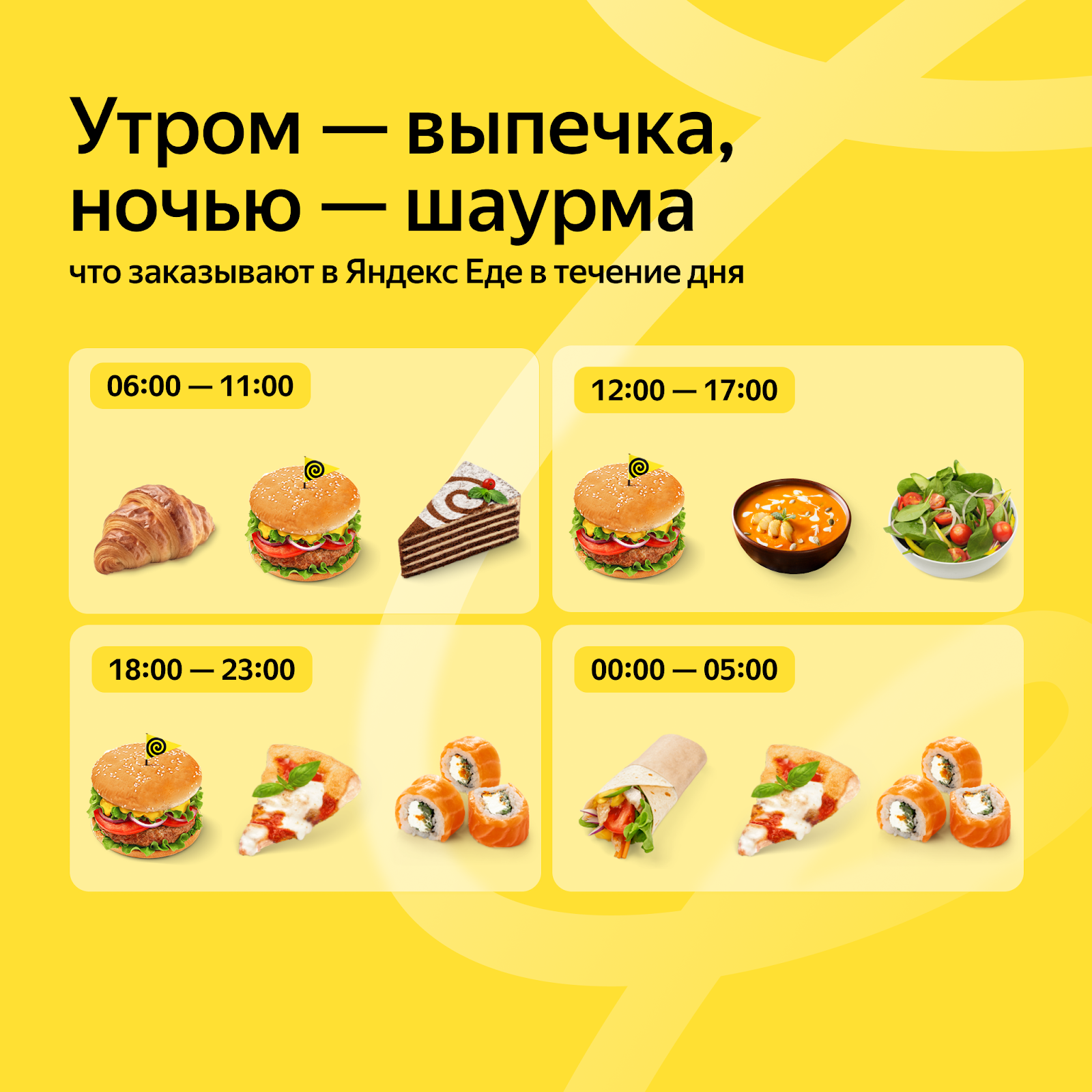 Яндекс Еда подвела итоги 2023 года и выяснила, что чаще всего заказывали на сервисе с доставкой из ресторанов и кафе за последние 12 месяцев. Бургеры и пицца — традиционно одни из самых популярных категорий блюд в Еде, и уходящий год не стал исключением. Бургеры и пиццу на сервисе чаще всего заказывают днём и вечером: с 12:00 до 17:00 и с 18:00 до 23:00. Ещё одна популярная категория блюд днём — супы. В ней по числу заказов лидируют борщ и том ям. Утром заказывают выпечку. А вот ночью многие предпочитают перекусить шаурмой — ее чаще всего выбирают после 00:00.