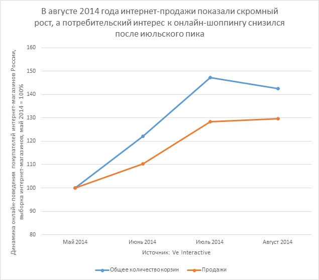 Что же происходило с интернет-торговлей в августе 2014 года? Ответ на этот вопрос дают данные международной технологической компании Ve Interactive. Ve Interactive поставляет программные решения интернет-магазинам, помогая им удержать или вернуть покупателей. При этом Ve фиксирует данные по сформированным электронным корзинам и продажам интернет-магазинов.