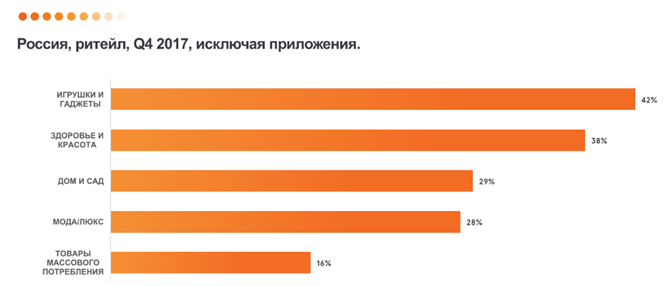 Всего доля in-app транзакций в четвертом квартале 2017 года составила 46%. Конверсия в ecommerce-приложениях составила 21%, что почти в четыре раза выше, чем в мобильных версиях сайтов (6%).