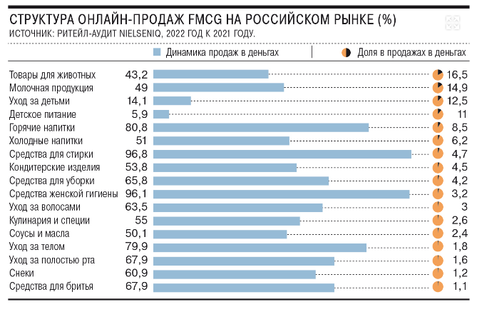 Средства для стирки и предметы гигиены стали в 2022 году наиболее быстрорастущими категориями продаж в онлайн-канале среди товаров повседневного спроса (FMCG). В 2021 году однозначными лидерами роста были снеки и холодные напитки, но теперь у сегмента новый драйвер. В 2022 году онлайн-продажи FMCG в целом выросли на 43,5%.
