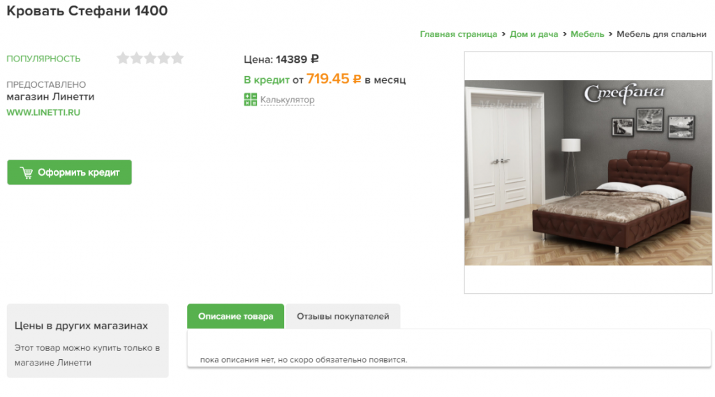 Стоит отметить, что, если верить информации с сайта вкредит.рф, такое название компания носит совсем недавно. Ещё до 1 августа 2018 года она называлась "Биржа Кредитов" и работает на российском рынке с 2010 года. В последние пару лет компания полностью переключилась на модель онлайн-кредитования покупателей интернет-магазинов. Например, та же кровать Стефани доступна в кредит и на самом сайте магазина Линетти. Теперь все эти товары будут собраны в одном месте.