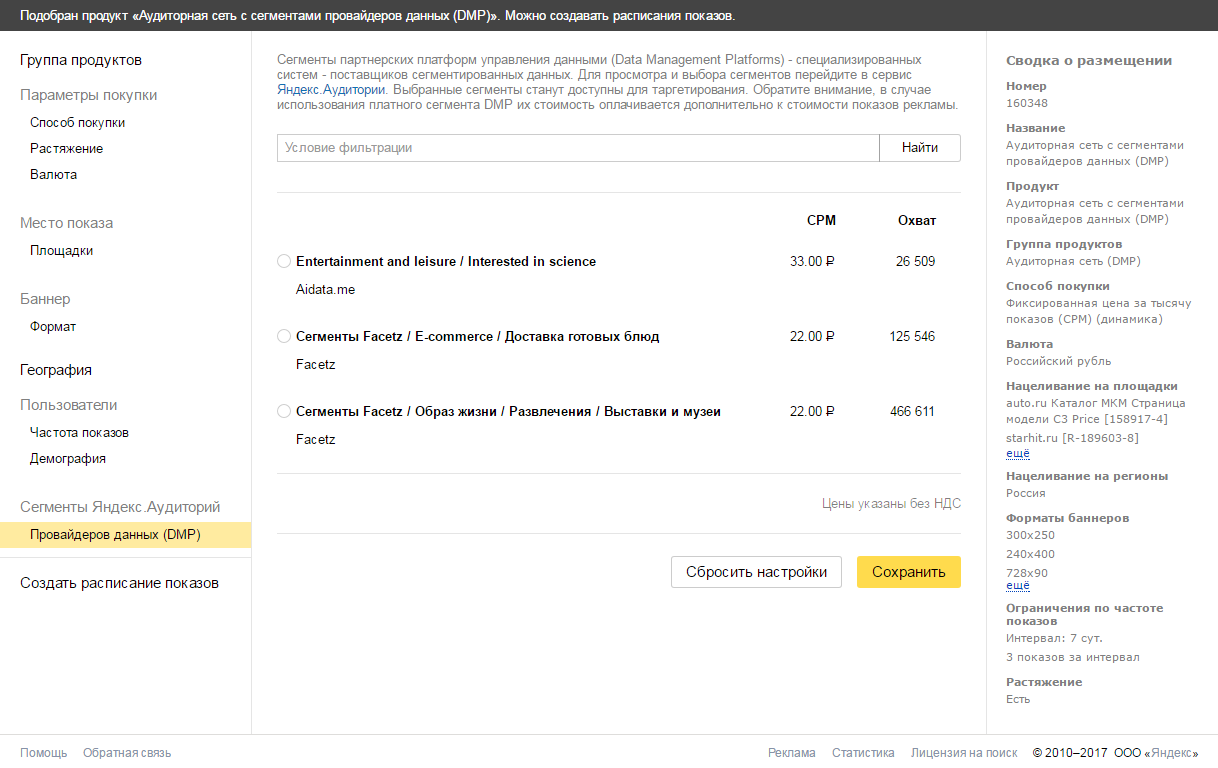 Список сегментов DMP с указанием их охвата и стоимости можно будет найти в «Аудиториях». Платные сегменты будут тарифицироваться по фиксированному CPM дополнительно к стоимости показов рекламы.