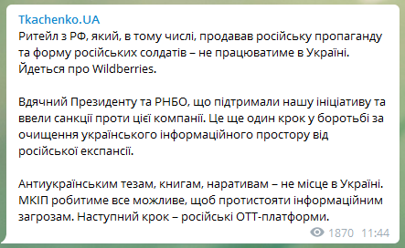 Кроме того, по его словам, санкции против Wildberries стали еще одним шагом в борьбе за очищение украинского информационного пространства от российской экспансии.