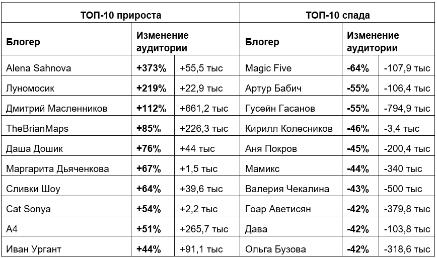 А вот наибольшие потери понесли те, у кого основными каналами были Instagram* и TikTok. Банда Гусейна Гасанова покинула свой TG-канал, и численность его аудитории сейчас почти на 800 тысяч меньше, чем год назад. Валерия Чекалина потеряла около полумиллиона подписчиков в Telegram за год. Возможно, это не конец спада: неясно, будут ли фанаты преданно ждать блогера или отпишутся до окончания судебных разбирательств, в которых завязана звезда. Визажист Гоар Аветисян лишилась около 380 тысяч подписчиков за прошедший год. Не лучше обстояли дела и у популярной шоувумен Ольги Бузовой (-319 тысяч) и TikTok-автора Ани Покров (-200 тысяч).