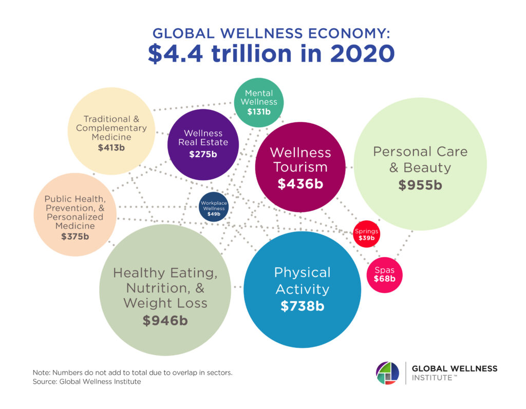 В 2019 году мировой рынок велнес-услуг достиг исторического максимума: его объем составил 4,9 трлн долларов. Эксперты прогнозировали, что в следующем году рынок продолжит расти, но из-за экономического кризиса обороты упали до 4,4 трлн долларов.