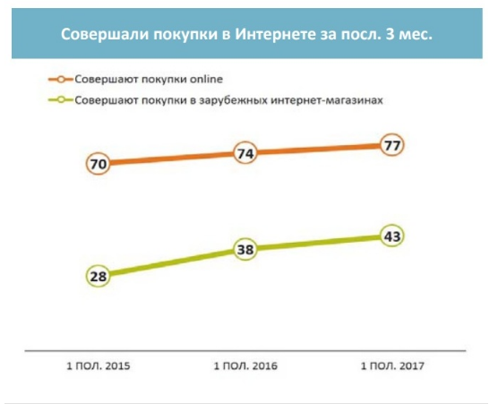 Эксперты Ipsos Comcon говорят, что если в первом полугодии 2015 года в зарубежных интернет‐магазинах совершали покупки 28% активных интернет‐пользователей, то в аналогичный период нынешнего года их число увеличилось до 43%.