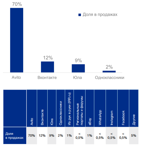 70% от всех C2C-сделок в интернете приходится на долю Avito. Сайт используют 88% продавцов и 76% покупателей, которые делают покупки онлайн у частных лиц. Впрочем, VK.com и "Юла" тоже популярны, но важно отметить, что такой старый формат как "Из рук в руки" закрылся, не выдержав конкуренции с новыми игроками.