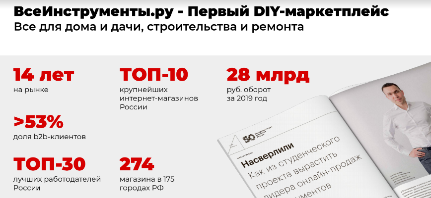 Несмотря на то, что общая аналитика рынка DIY по России показывает не самую позитивную динамику — падение объемов продаж от 30 до 70%, при росте доли онлайн-покупок с 35% до 45% — продажи «ВсеИнструменты.ру» в апреле на 39% год к году. Наибольший рост показали категории: спецодежда (+112%), крепеж (+129%), сантехника (+110%), климатическое оборудование (+92%).