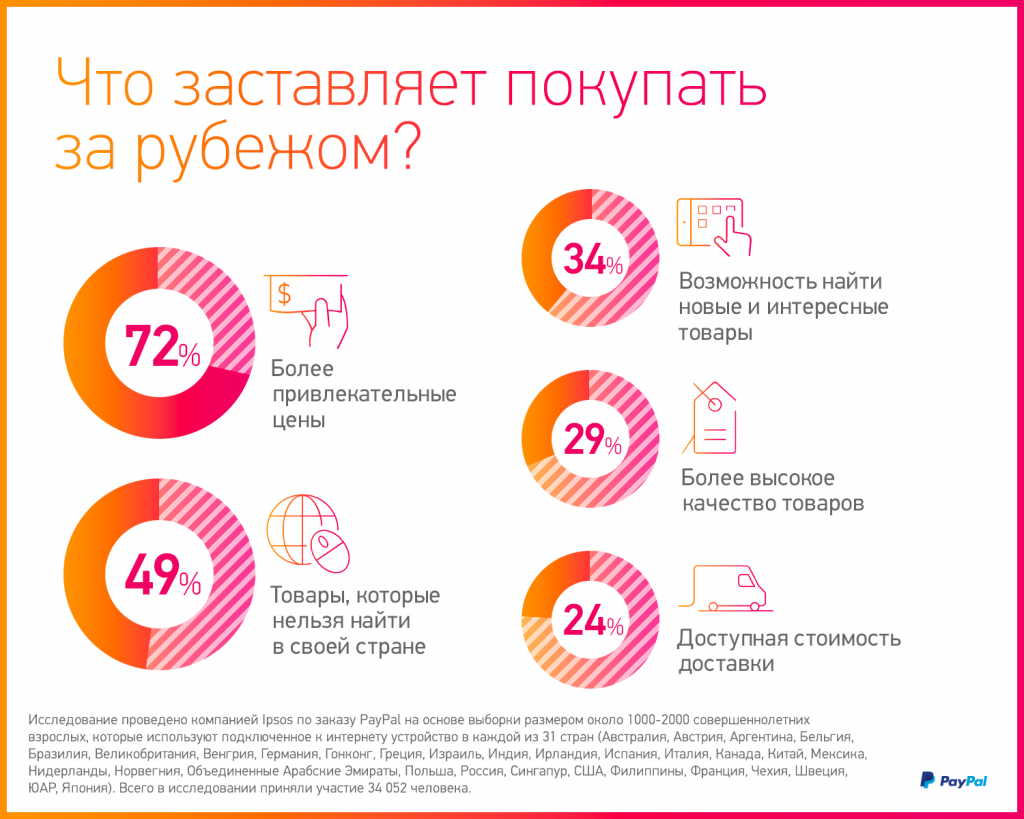 - Продавайте уникальные товары. Второй после выгодных цен (72%) значимой причиной, почему покупатели предпочитают совершать покупки в зарубежных магазинах, является то, что эти товары труднодоступны или недоступны в их собственных странах (49%). Третье место занимает стремление находить новые интересные продукты (34%).