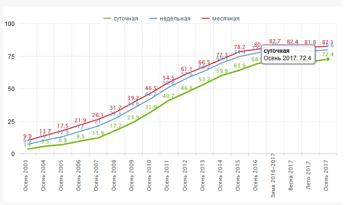 Согласно осеннему исследованию GFK, аудитория eCommerce растёт высокими темпами. Аналитики Gfk Rus насчитали аудиторию в 24 млн. человек в возрасте 16-55 лет. Она выросла с 25% в 2016 году до 30% в 2017 году - по данным Всероссийского омнибуса GfK.