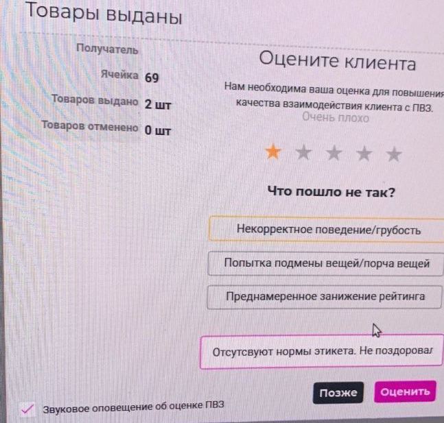 В частности, работник ПВЗ может пожаловаться на то, что клиент грубит или некорректно себя ведет, пытался подменить товар или повредить его, умышленно занижает рейтинг ПВЗ или просто не поздоровался.