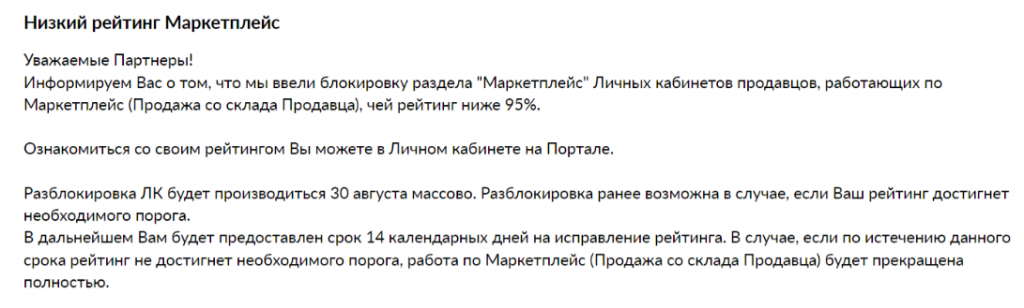 "В дальнейшем Вам будет предоставлен срок 14 календарных дней на исправление рейтинга. В случае, если по истечению данного срока рейтинг не достигнет необходимого порога, работа по Маркетплейс (Продажа со склада Продавца) будет прекращена полностью", - добавляется в сообщении.
