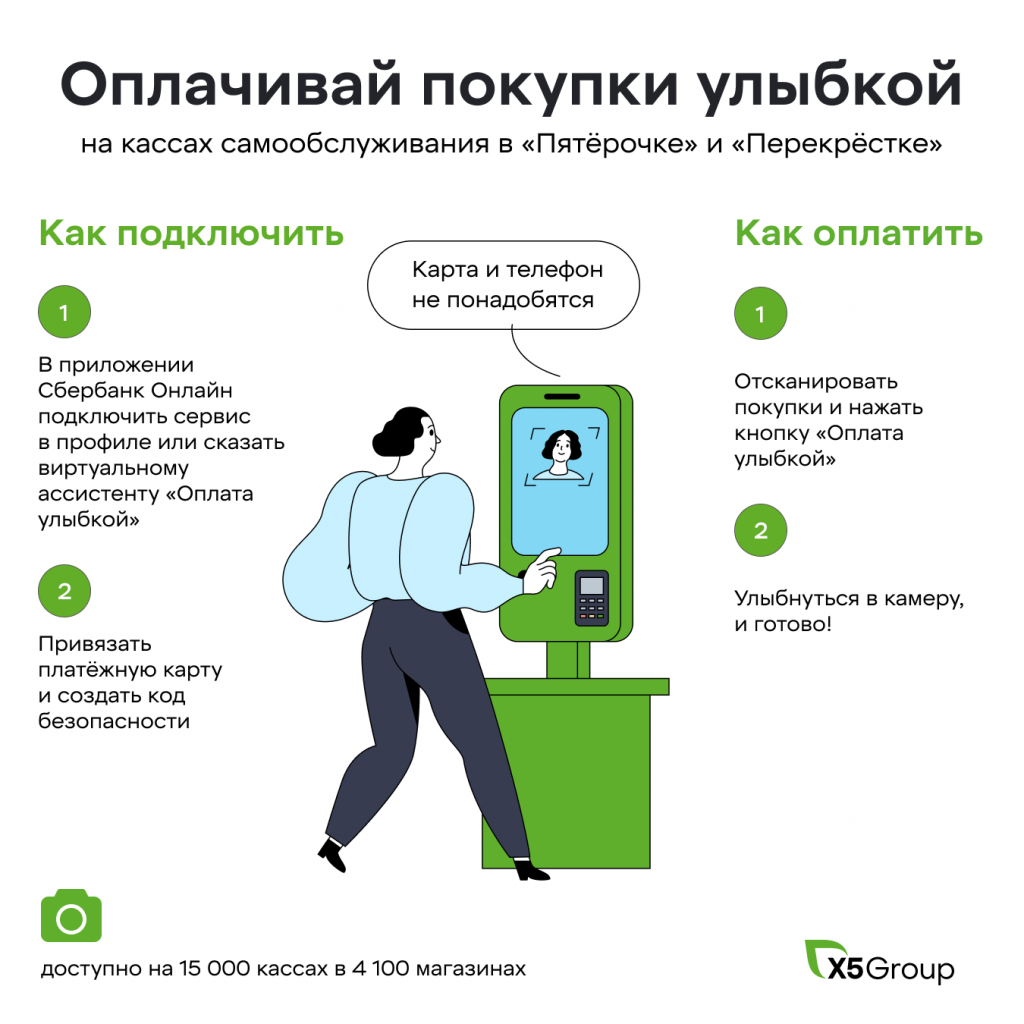 - На кассах самообслуживания, установленных в магазинах Х5, после сканирования товаров нужно выбрать сервис "Оплата улыбкой" и посмотреть в камеру.
