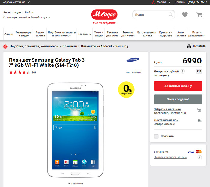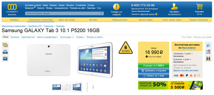 Сеошники Сотмаркета придерживаются традиций старой школы и продвигают страницы товара. Помимо перечисления в хлебных крошках всех возможных категорий, магазин отказался от использования длинных урлов, и размещает все свои товары по вполне логичному и удобному адресу вида http://www.sotmarket.ru/product/samsung-galaxy-tab-3-10-1-p5200-16gb.html, т.е. без использования вложенных категорий.