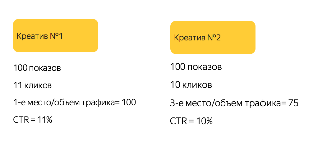 Первое объявление вроде бы кликабельнее, что выглядит логично - ведь оно показалось на первом месте спецразмещения. Но простой CTR не учитывает объем трафика: на более высокой позиции 100, на пару ступенек ниже - 75. А взвешенный CTR дает уже другую картину: