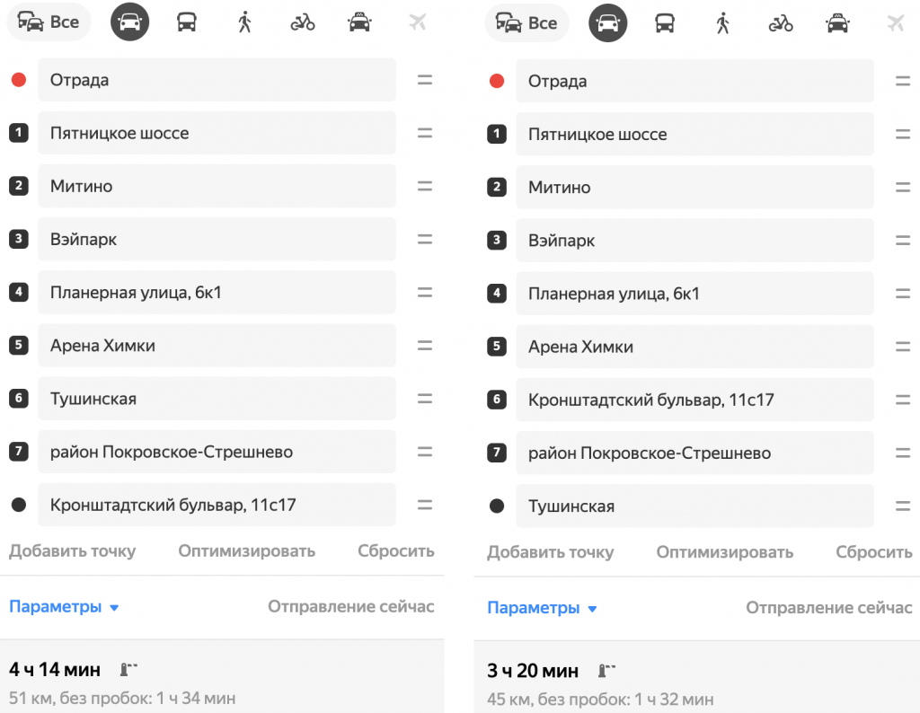 Благодаря оптимизации маршрутов курьеры смогут уменьшить время в пути на 15-20%, поясняют в компании. Вот пример того, как это делается, два маршрута, один из которых построен вручную, а второй - с помощью программы: