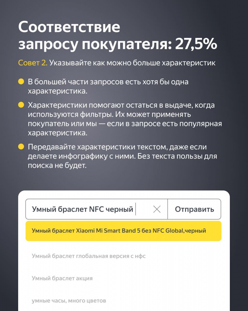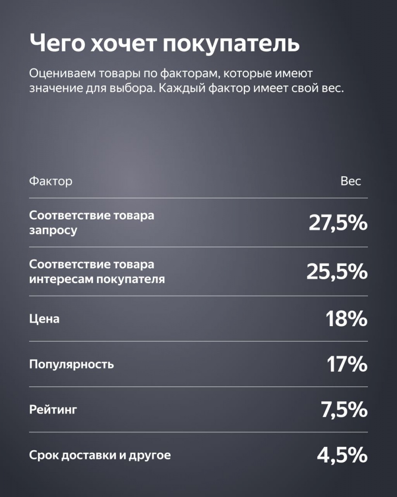 Как выяснилось, главным фактором, влияющим на ранжирование, является точное описание товара. Этот параметр оказывает наибольшее воздействие на позицию карточки в результатах поиска на Маркете - до 27,5% зависит от него.