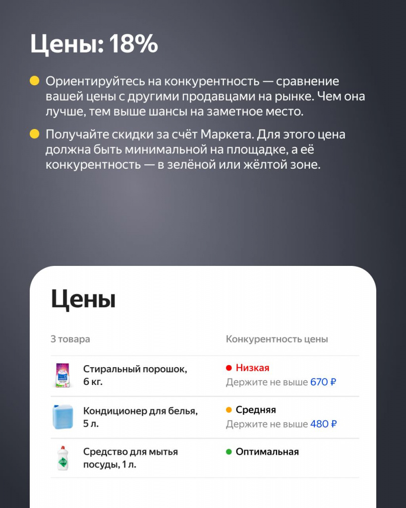 Если цена товара равна или ниже, чем на других крупных площадках, продавцу на Маркете предоставляется дополнительное преимущество в ранжировании. "Вес" этого фактора составляет 18%. В компании поясняют, что цена товара играет ключевую роль для покупателей при выборе интернет-магазина. Более 60 процентов опрошенных участников исследования сравнивают цены на 2-3 площадках перед совершением покупки.