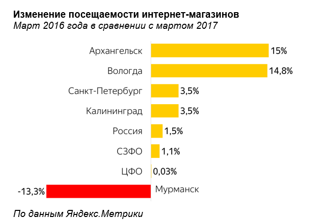 Заметнее всего посещаемость онлайн-площадок выросла в Архангельске и Вологде - на 15% и 14,8% соответственно. Петербуржцы и калининградцы за год тоже активнее стали посещать интернет-магазины. С марта прошлого года по март 2017 года число посещенных интернет-магазинов выросло на 3,5%.