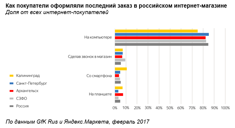Мурманск стал единственным городом, где число переходов в интернет-магазины сократилось со всех устройств. Жители города заходили на сайты меньше и с компьютеров, и с мобильных.
