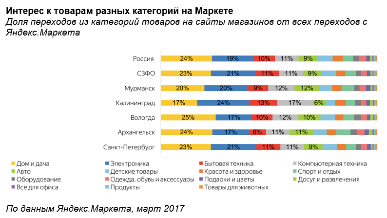 Интересно, что за год в Северо-Западном федеральном округе выросла аудитория Яндекс.Маркета. Количество переходов с площадки на страницы интернет-магазинов увеличилось с марта 2016 по март 2017 года на 18%. В частности, за этот период сильно выросло число переходов в Санкт-Петербурге - на 21%.