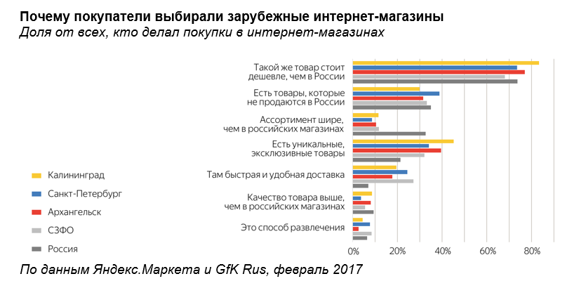 В Северо-Западном федеральном округе китайские магазины популярны, но лидируют пока отечественные. В российских магазинах пользователи предпочитают покупать компьютеры, косметику, товары для здоровья, автозапчасти, товары для дома и сада, а также товары для животных, а в китайских - одежду, электронику и детские товары.
