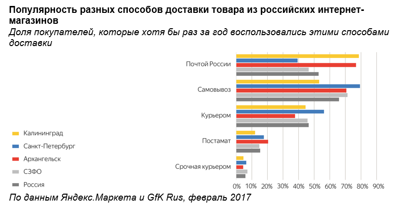 Кроме того, в интернет-магазинах, по мнению покупателей, сейчас хорошая доставка. А опрошенным зачастую лень ходить по магазинам самим. Товары получают в основном через "Почту России" и с помощью самовывоза. За год самовывозом хотя бы раз воспользовались 71% покупателей. Реже всего пользуются услугами курьеров.