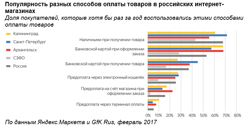 Оплата покупки на северо-западе России чаще всего производится с помощью наличного расчета. Хотя бы раз за год наличными платили 43% покупателей. В среднем по России оплата наличными популярнее - ее выбирали 68% онлайн-покупателей.