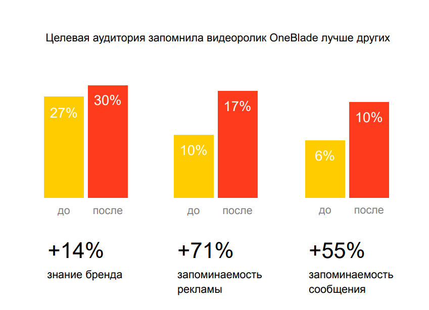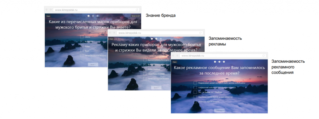 Среди вопросов: какие торговые марки пользователь знает в сегменте и рекламу каких брендов он уже запомнил. После двух опросов результаты контрольной и экспериментальной группы сравниваются.