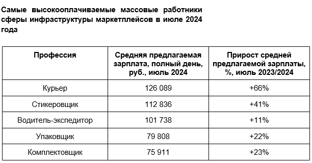 При рассмотрении профессий в сфере инфраструктуры маркетплейсов в расчет принимались специальности массового сегмента, для которых работодатели чаще указывают фиксированные зарплатные предложения в вакансиях. При этом курьер оказался самой высокооплачиваемой массовой профессией, задействованной в сегменте — в июле текущего года соискателям предлагали в среднем 126 089 рублей в месяц за полный рабочий день (+66%).