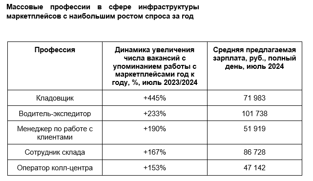 Лидером по приросту активных вакансий с упоминанием работы с маркетплейсами в июле текущего года стала профессия кладовщика — за год количество предложений о работе выросло в 5,5 раза (+445%). На втором месте — профессия водителя-экспедитора с приростом вакансий в 3,3 раза за год (+233%). Спрос работодателей на менеджеров по работе с клиентами вырос в 2,9 раза (+190%).