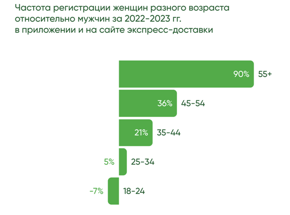 Ситуация начинает меняться в более зрелом возрасте: женщины старше 54 лет пользуются доставкой на 90% охотнее, чем мужчины-сверстники. Тенденцию можно объяснить тем, что целевая группа покупательниц в этом возрасте характернее занимается вопросами организации быта для всей семьи и делает заказы чаще. Кроме того, по статистике Data Insight, самой многочисленной группой пользователей являются именно женщины и покупатели с детьми, которые охотнее выбирают онлайн-сервисы для решения бытовых вопросов.