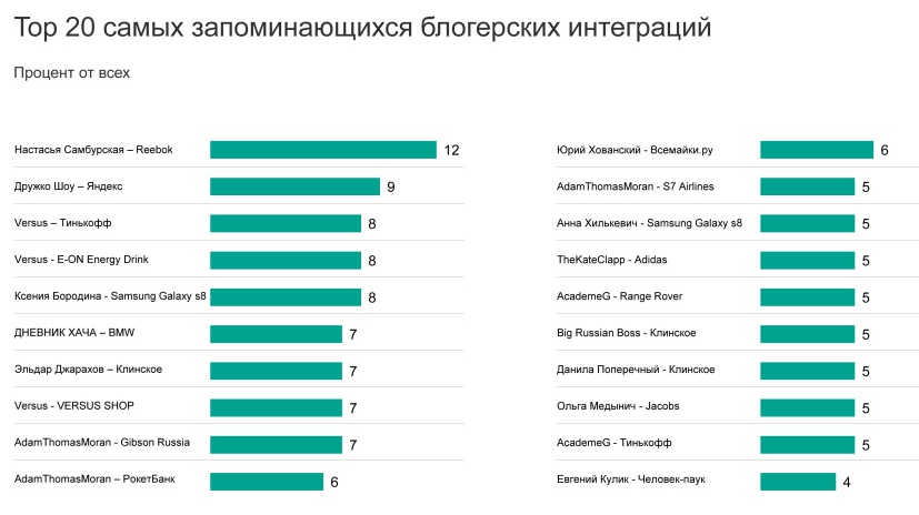 Как показало исследование, лучше всего "зашла" реклама бренда Reebok в партнерстве с актрисой Настасьей Самбурской. Кампания продвигала одежду для занятий фитнесом. Этот пост вспомнили 12% опрошенных.