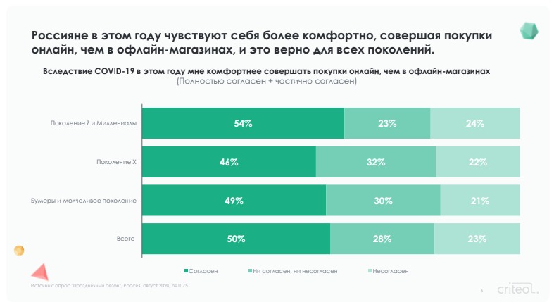 Россияне будут чаще совершать покупки в мобильных приложениях и на омниканальных платформах. Согласно исследованию Criteo, каждый второй россиянин во время пандемии установил как минимум одно приложение для онлайн-шопинга. 54% респондентов всех возрастов сказали, что продолжат пользоваться скачанными сервисами и после пандемии.